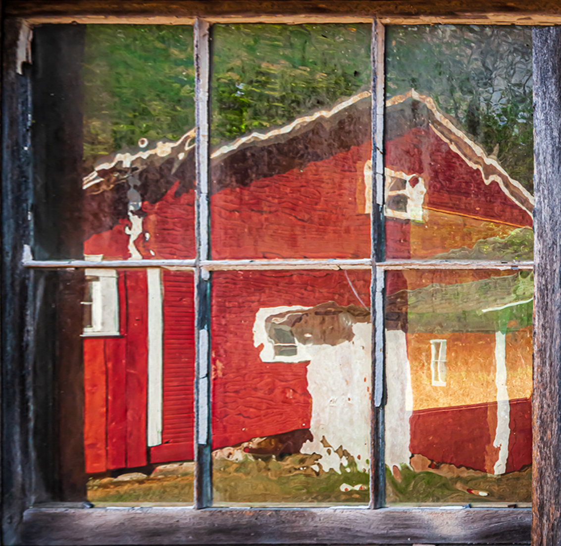 I am not sure that it fits in the category of "Through the window." My first impression was that this is more of a reflection, but there again it maybe a well have been taken from a well lit interior looking out through some old striated glass. I think the weathered timber debunks my second thought.