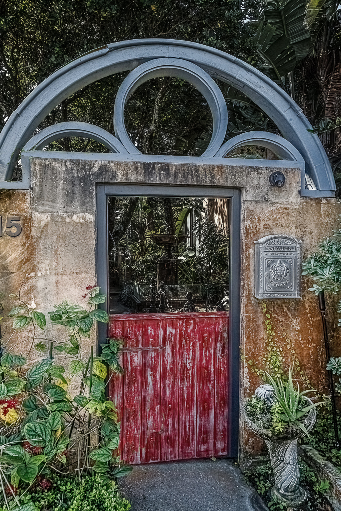 I find the leaves jutting out in-front of the gate distracting, so clone those out. Also darken and desaturate the background beyond the gate. Then give that area a slight touch of Gaussian Blur (1px). That makes the eye concentrate on the lighter foreground, rather than the garden beyond.