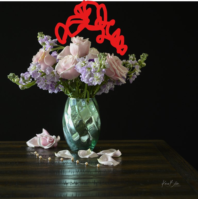 I like your lighting. I am not a flower arranger but I feel the flower arrangement lacks some height. My eye is led upwards by the vase and I want that vertical line to continue through the flowers rather than creating a T shape at the top.