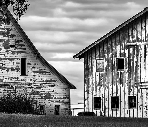 You have found a fine example here with peeling paintwork on the walls. I like the black and white version of your image, but the lighting on the other barn is a little more interesting and I wonder if you couldn't also include it in your image.