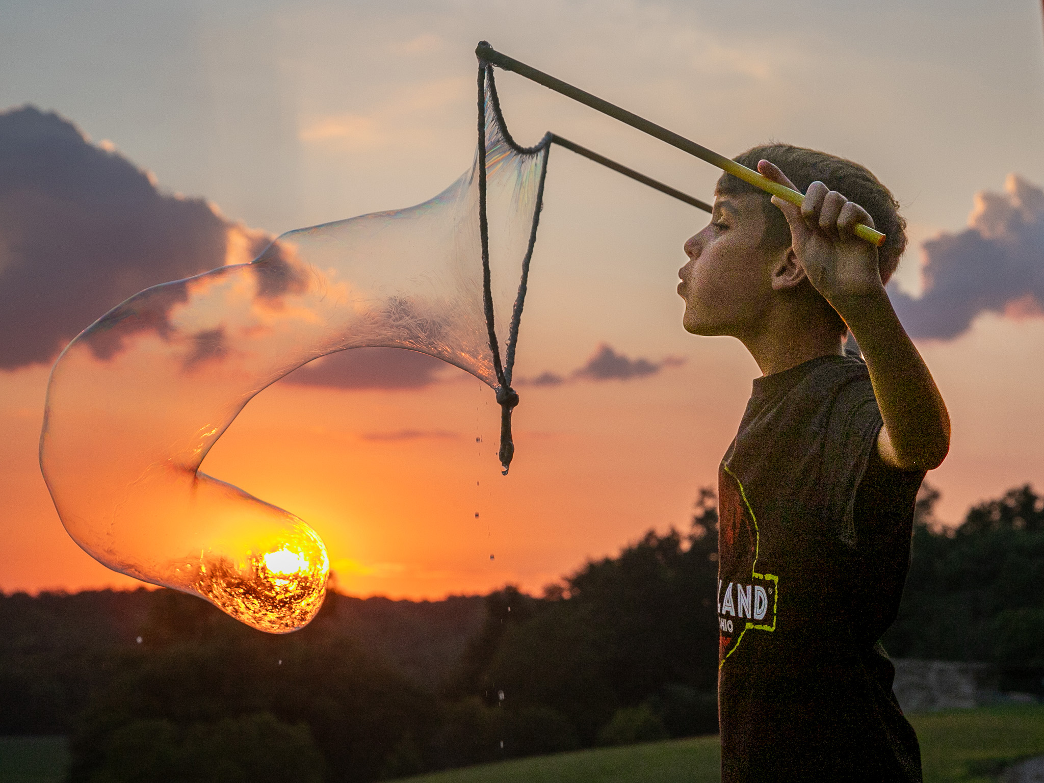This is a great capture. Your timing was spot on to catch the setting sun behind the bubble. The sun lies nicely on the intersection of two "thirds" lines.