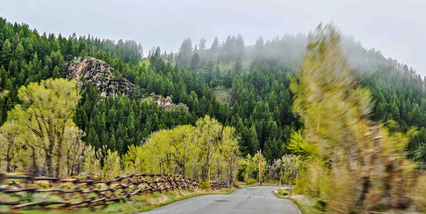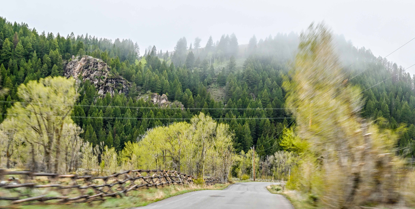I like your creative treatment - this certainly conveys the image of driving down a road at speed. But I think the bland roadway detracts from the impact. Selecting the roadway and decreasing the contrast produces the first image below. |