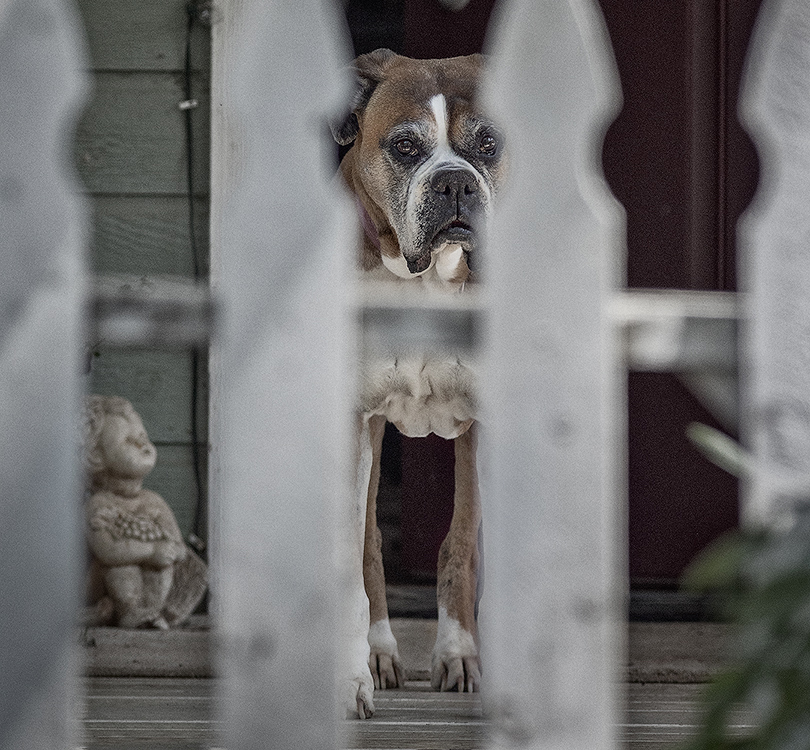 The dog staring from behind the picket fence, although an unusual composition, works for me. But I find the door handle a major distraction, and would suggest cropping to just above the dog's head. The figurine at left seems to be looking up at the dog! |