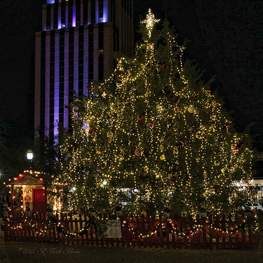 Here is another of my photographs of the Christmas 2022 tree on the Tyler, Texas downtown square. This is cropped tightly on the tree, but I still have black sky. This photograph is not as interesting to me because it can be any Christmas tree anywhere since there is nothing to identify its location. Yes - think of myself as a Tylerite. I think the business in the background are distracting. Granted - this photograph can be placed on a greeting card that is square after it is printed and folded. |