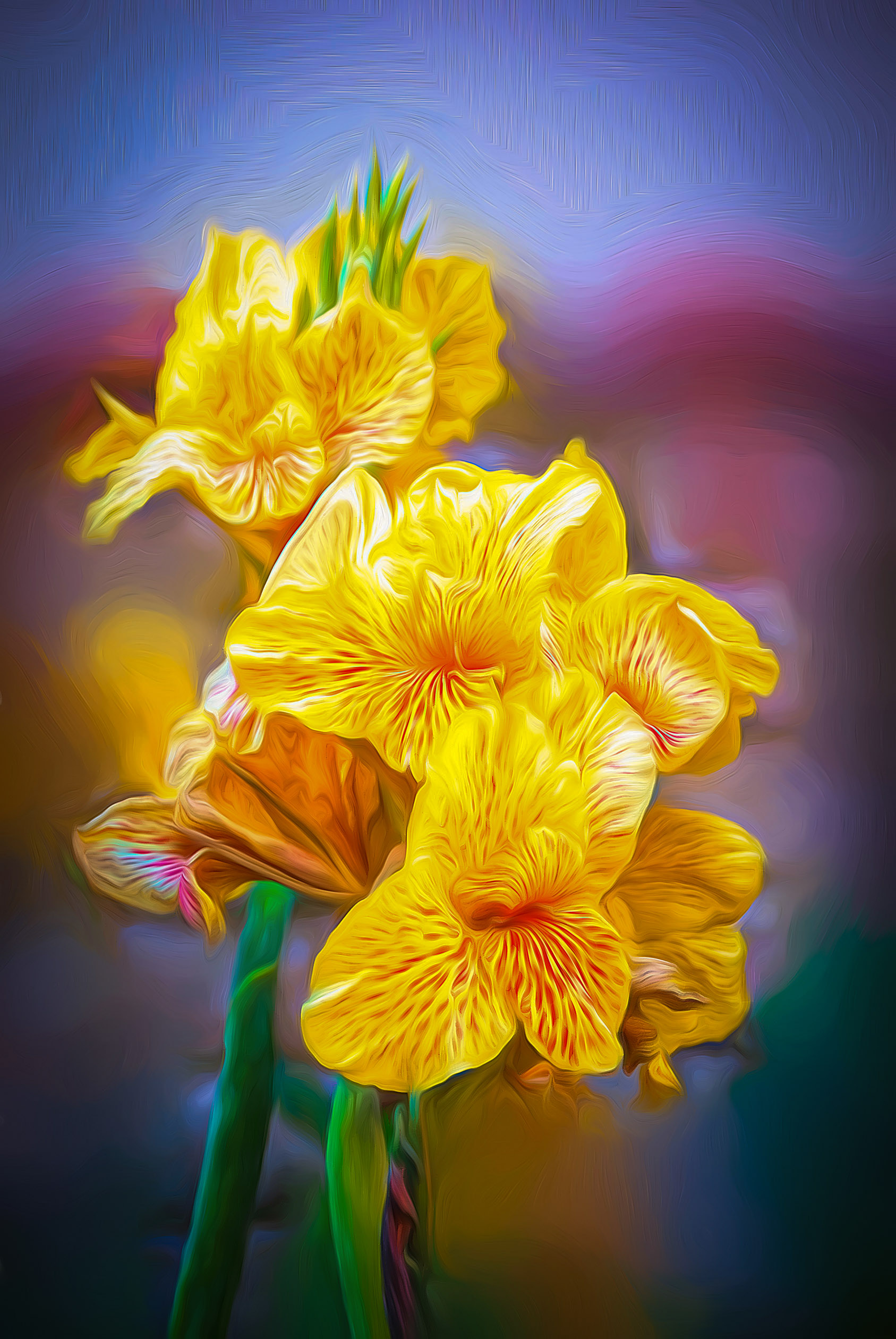 I experimented with your "Topaz" view by reducing exposure and adding a vignette. With your flowers, you have replaced the "freckles" on the gladiola with brush strokes. Nice touch |
