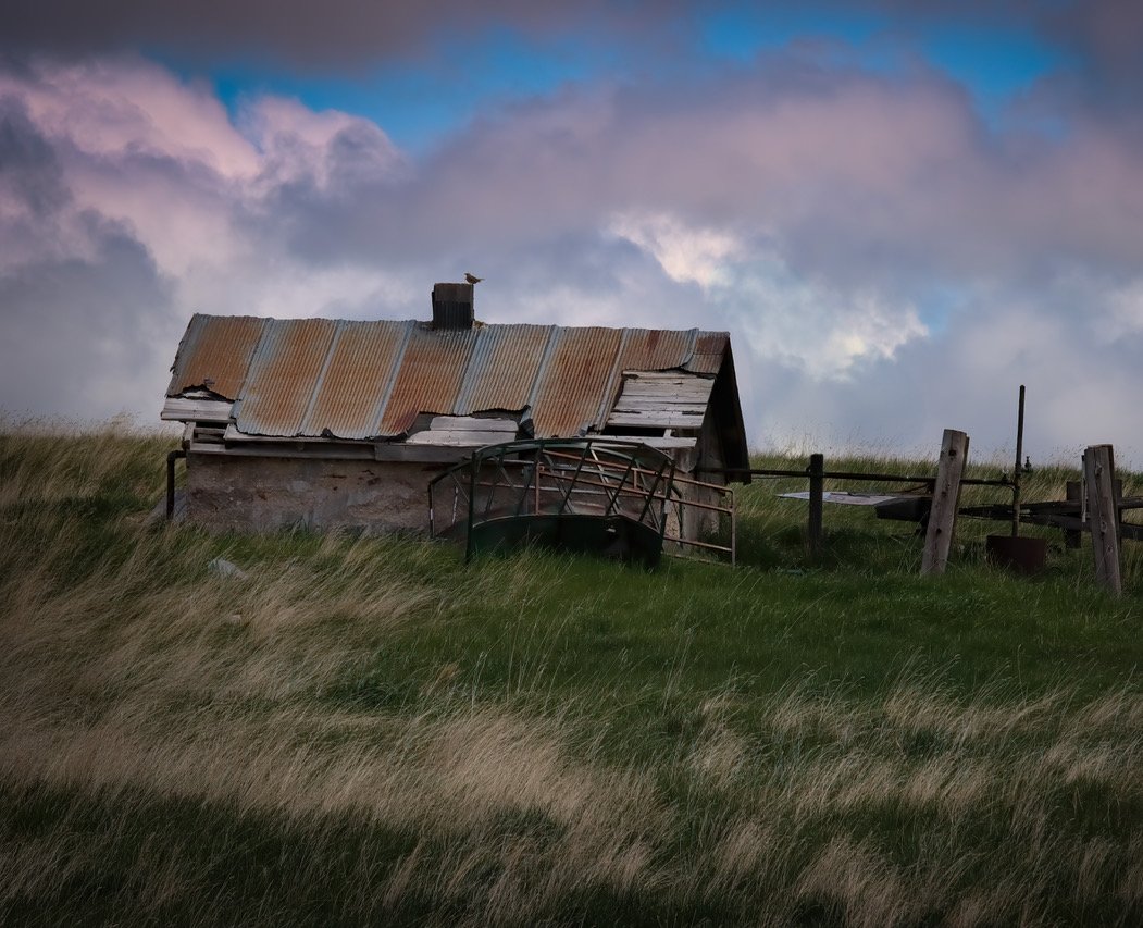 You do manage to find a lot of old abandoned farm buildings, and your photographs show them well. This is another one of your good examples. (I have to make a couple day trip to Eastern Oregon to find old farm buildings). I like the uniform lines of the grass which, for me, shows that the wind was blowing pretty hard. The clouds in the sky work for me in two ways; first they give nice texture filling the upper portion of the image and the give good color contrast, second the way they fill the sky creates a sense of stormy weather which I think you augment well with the lower exposure of the barn and grasses.