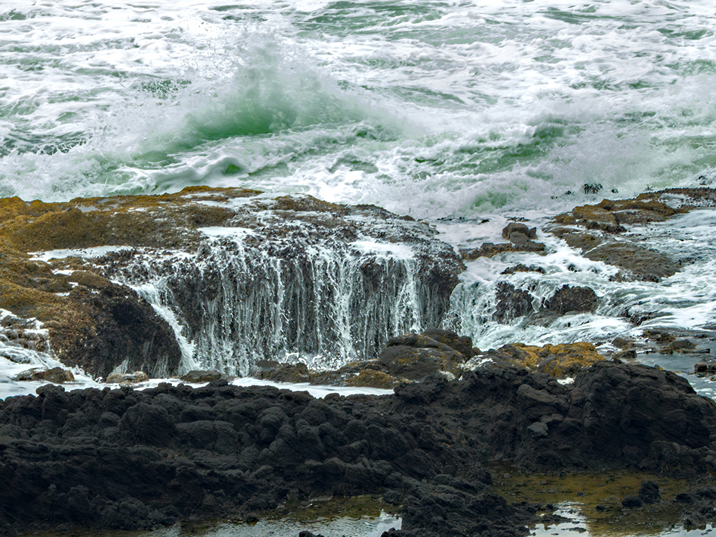 This is a tough one for me to judge Darcy, it's only 20 miles north of my house and I drive by it whenever going to the next town north of us (Yachats, OR) to my favorite wine shop. It's a favorite photo subject and pretty much everyone in our camera club has photos of it from all times of year and all angles. Considering the weather and that you weren't able to get closer to the edge I think you did a great job with this shot.