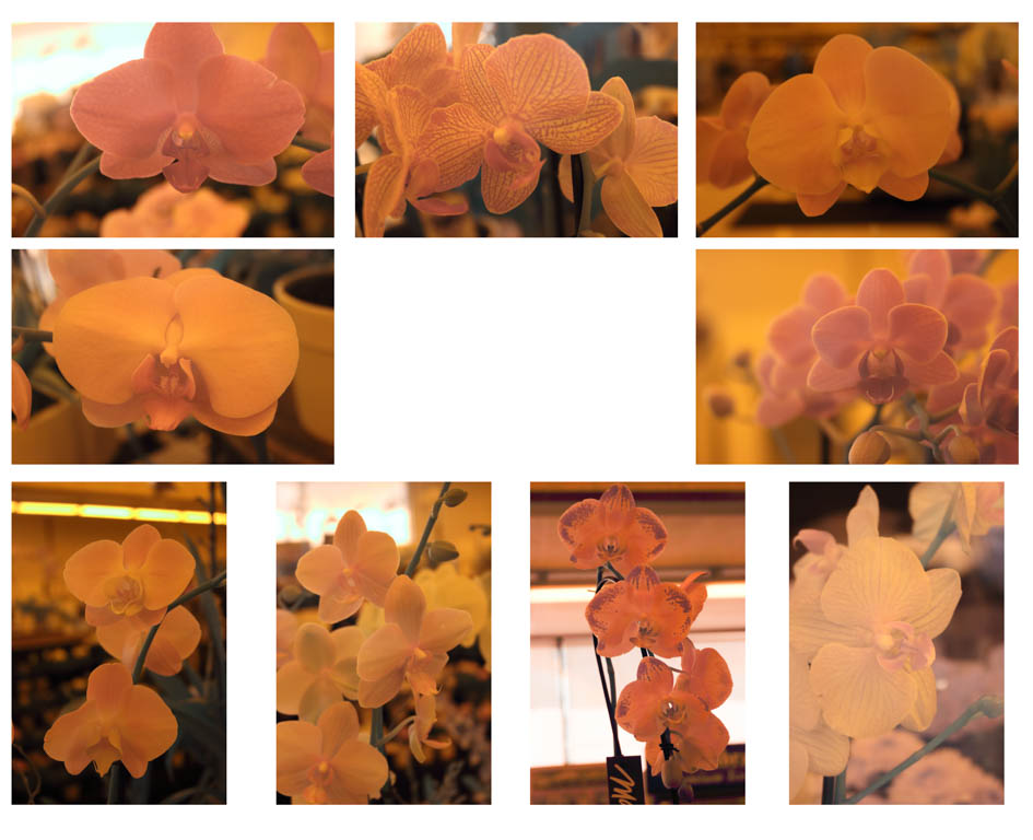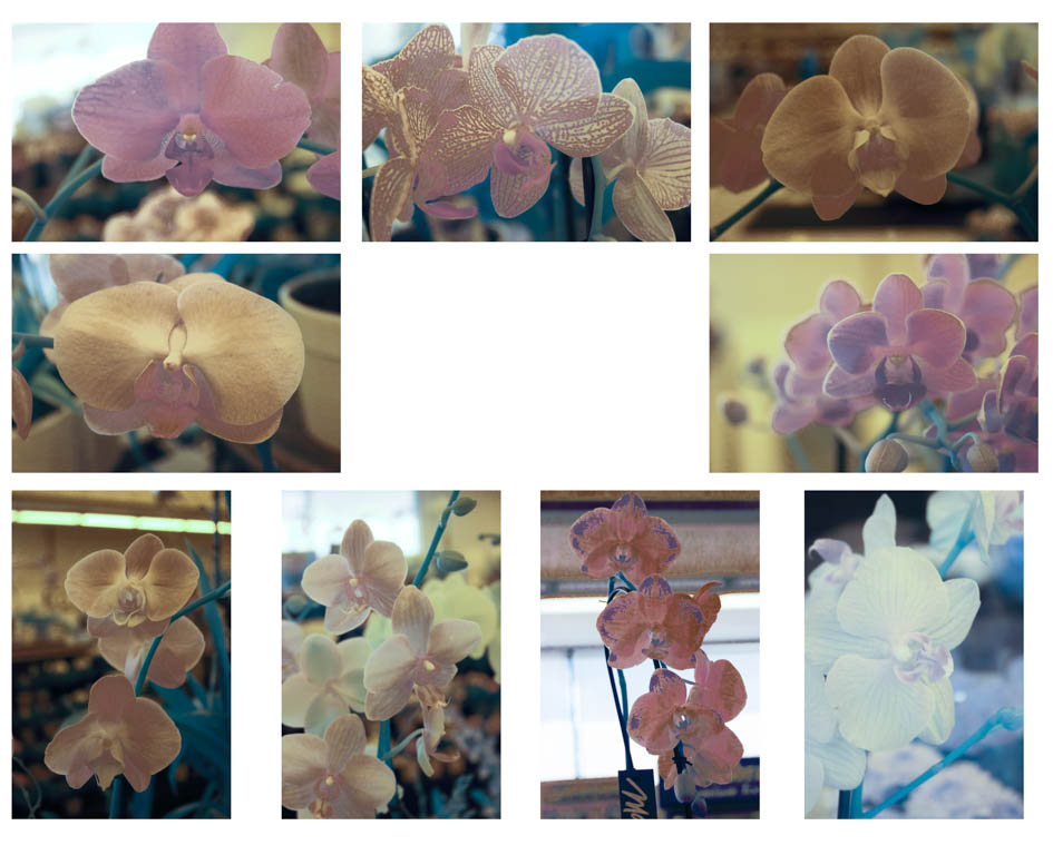 For my next attempt I did not want to spend about $200 on orchids trying a variety, I took IR images of nine different ones in a grocery store under strong floursecent light. I took the SOOC images converted to 16 bit .tiff files and arranged them in one image. see the attached |