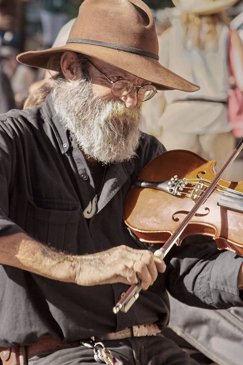 I like the concentrated expression of the fiddler as he plays his tune. To me, I feel he is listening intently to other musicians to keep in sync with the rest of the group. To that observation, I like that his ear is so prominent. The highlights in his eyes make him look lively. From the background, I can tell the setting is a festival or he is a street musician. I think this is a nice portrait.