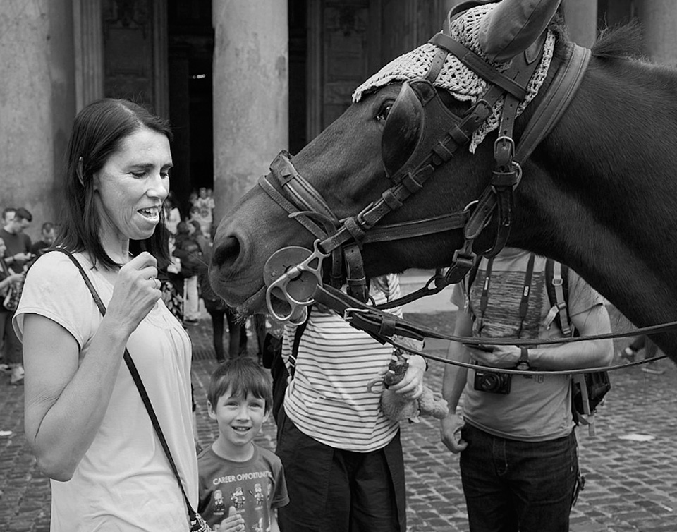 I like the interaction between the woman and horse, her expression of delight with a hint of of trepidation in that the horse is reacting to her. I can tell that she is not used to being around horses. Is the horse looking for a bit to eat from the tourist? The expression on the boys face is precious, it looks to me that he is thoroughly enjoying the interaction. Nice story.
