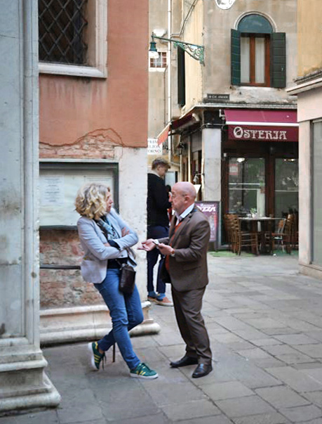 I think you could increase the emotional content of the image by including the pillar to the left of the woman in the image so that it appears that she has been backed into a corner. (On closer inspection, you can see that she is leaning against a railing.) On the other hand, having her so close to edge of the frame for me creates some tension. I think that the area on the right is not contributing to the image, and for me, makes the image a little unbalanced. I do not know if you intended to have us wondering what a Caribbean pirate themed store is doing in Venice, but that would be a mixed message image. I think that a vertical crop would also make you feel more like you were in the tight streets of Venice. My preference would be to have a closer view of the people in the image.