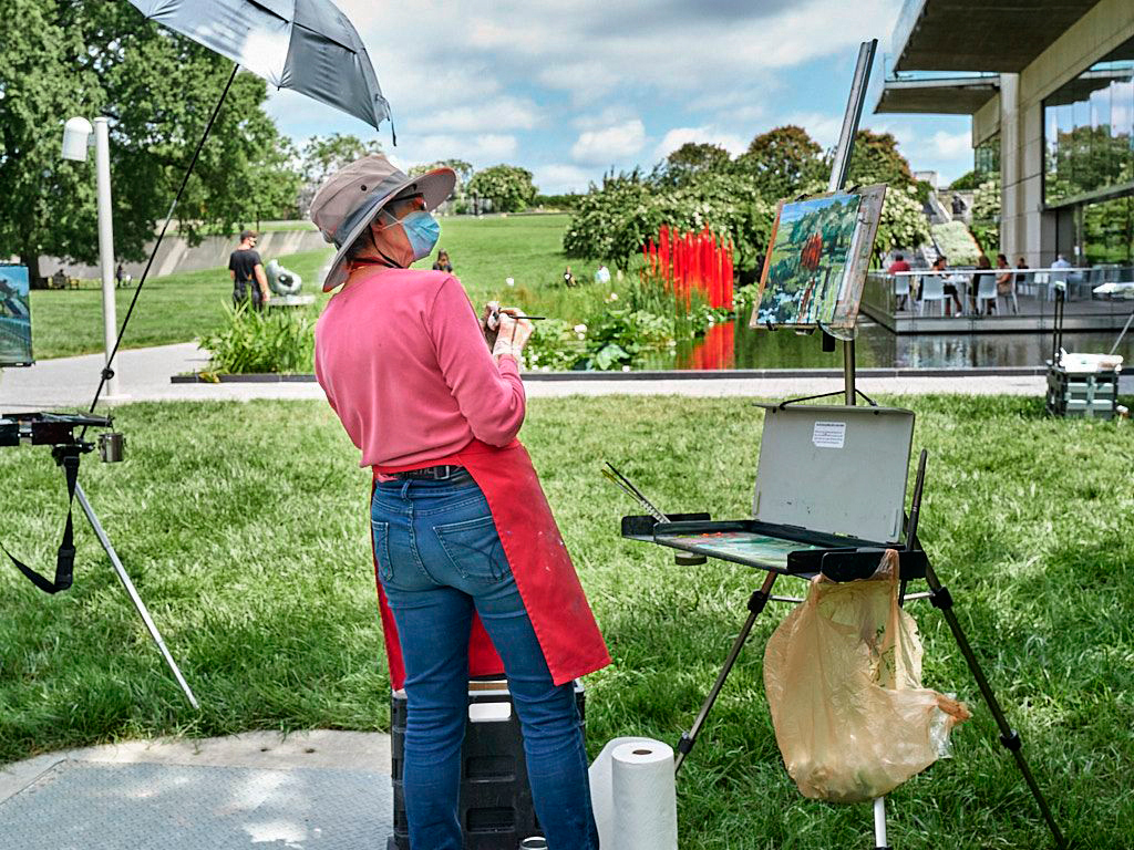 I like the woman's pose, leaning back and contemplating her work, what to do next. You caught her at just the right moment. The three points of red color against the complementary green draw try eye to those parts of the image.