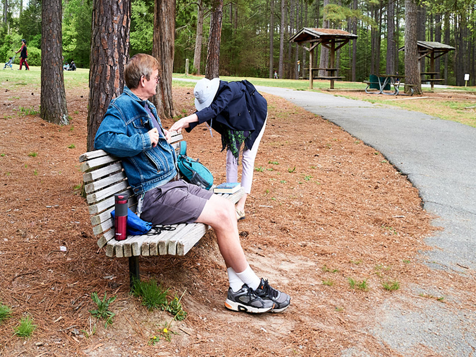 I too was bothered by the slope in the background and the tilt in the trees. I took a stab at leveling the horizon line using the trees and structure for a vertical guide, leaving some slope, by using the skew tool in photoshop so that the couple with the stroller would still be in the image. I thought that much of the path was not needed and the composition would be better balanced without it. I would consider cloning out the white sigh near the right edge of my crop, or cropping in just a little bit tighter. |