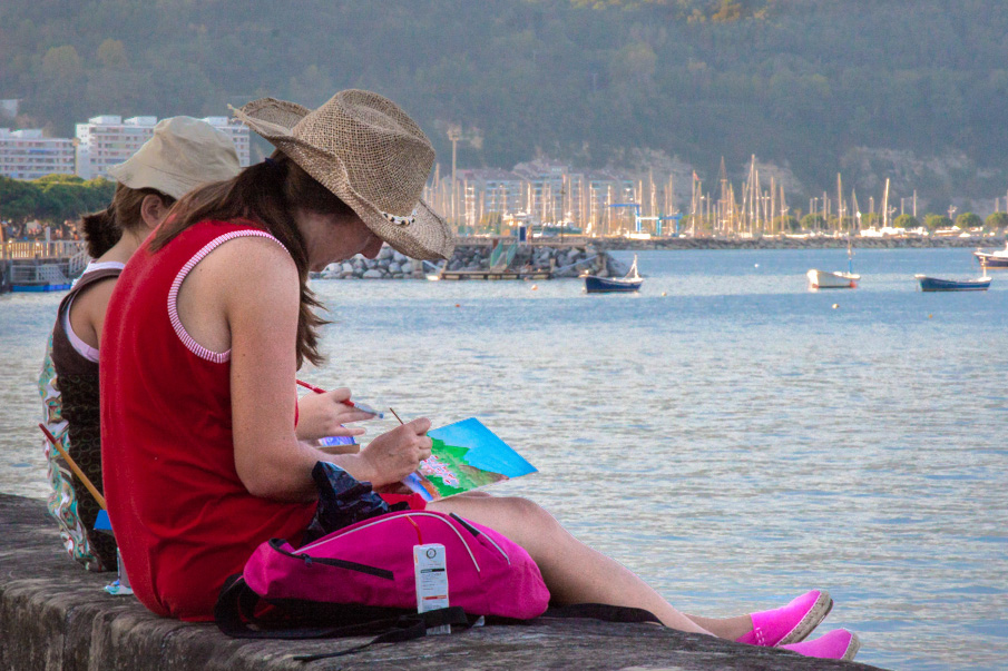 This image is not working for me. Yes, you have the story of an artist painting a scene in the afternoon, but the image composition does not draw me into that story. There are a number of elements that attract my attention, but those elements draw me away from the story. I first see the bright red of the painter's back, then to the bright boats contrasted against the hill in the background, and then to the bright sky, then the bright water, then back to the Artis's bright pink shoes, and eventually to the artwork. When looking at a photograph, I am attracted to areas that are bright, if there is color, the saturated areas especially of red and yellow, areas where there is high contrast, to human faces, and symbols. Though the artist's face is dark, I still find my way back to her face and eventually to what she is doing.