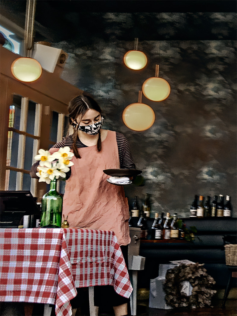 The "motion blur" is from camera motion, not subject motion. I took the image as I was walking by, I probably was turning the camera to be facing the waitress, thus blurring both the foreground and background. I did not expect to see camera blur at 1/60 of a second with a wide angle lens, but apparently there are limits even in this range. |