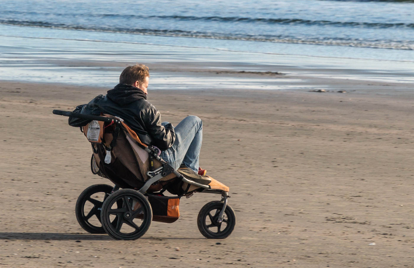 This strikes me as depicting a peaceful late afternoon beach scene, possibly the man waiting for sunset. Or is this morning on the east cost; as a west coast person I would assume sunset on our beaches. The vey directional sidelight illuminates your subject well. I do not mind that we can not see the child, it looks like the man is quite enjoying the beach, though it does look like an unusual buggy for an adult. I think the man is positioned well in the image with plenty of space before him to gaze into. I like that there are disturbances in the sand in the direction of his gaze that contains me in the image, the larger of the disturbances leads me back to the man.