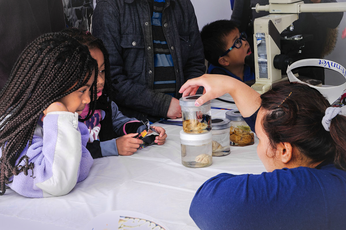 I like the intensity of the girls interest in the demonstration, their fascination with the samples. That fascination draws me to look at the biological samples so I can share in their amazement. What is in those jars? Some of them look like brains to me. I also like the look of amazement of the boy in the background. I think this image captures the feeling of the science fair well.
