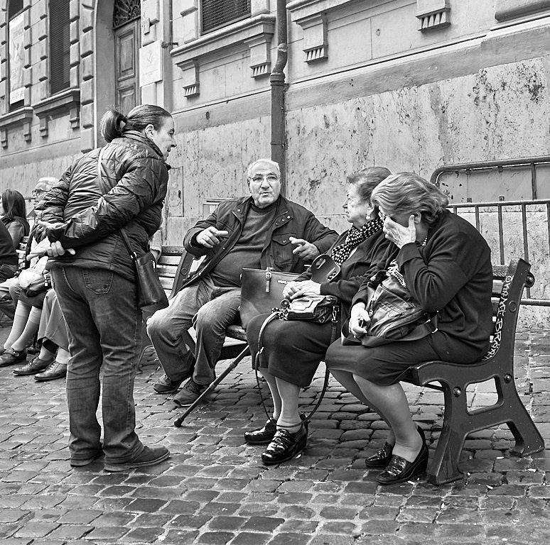 I like the interaction between the subjects and the expressions on their faces. Their gestures add to the expressiveness of the subjects. I like your choice of a low point of view. The monochrome rendition works well for me. I think the crop is just right.