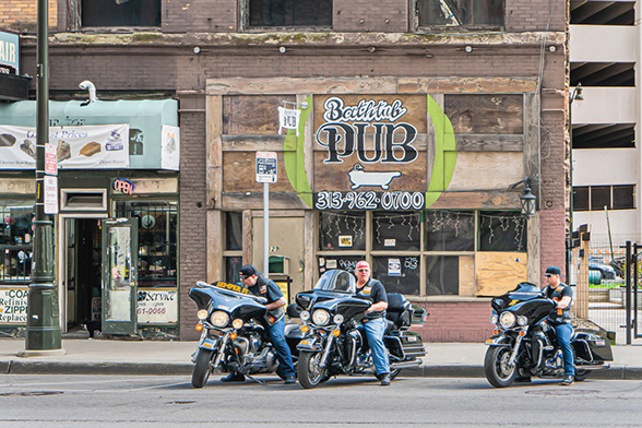For me, the charm in this image is the motorcyclists poised in an old commercial area of town.