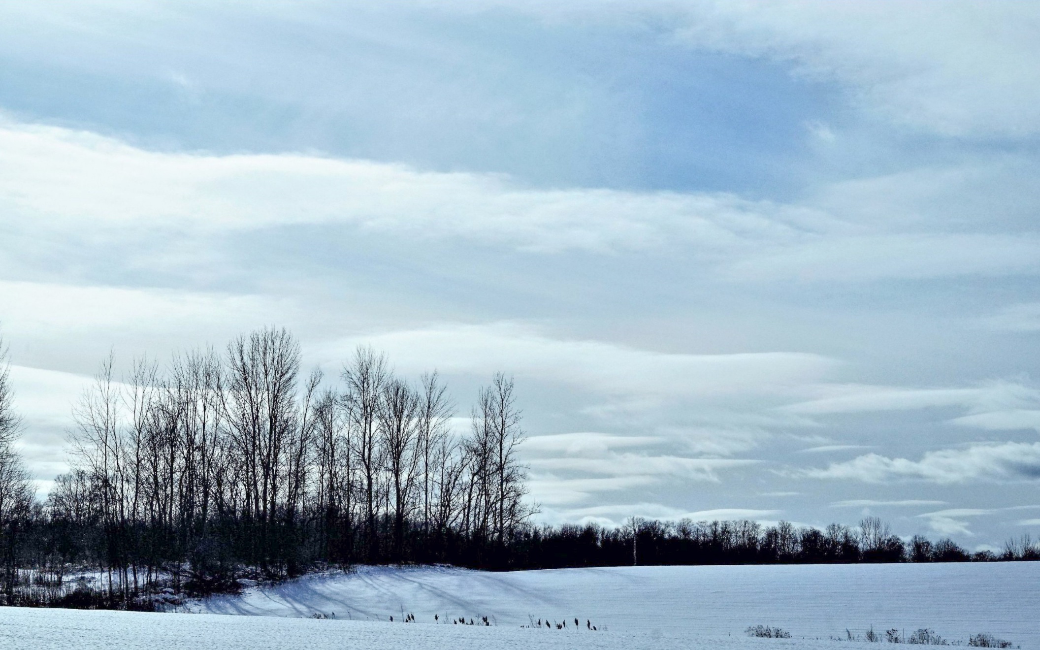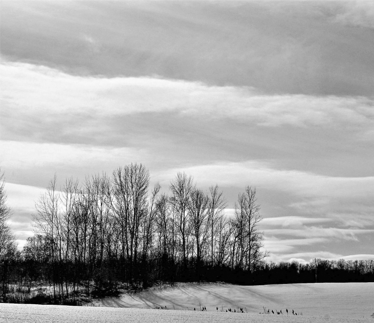 Hi Robert, great suggestion. Thank you. Here's the image in B&W. I agree that the B&W tones really bring out the different layers and elements, especially the silhouette of the trees, the shadow on the snow, and the layers of clouds and snow on the fields.