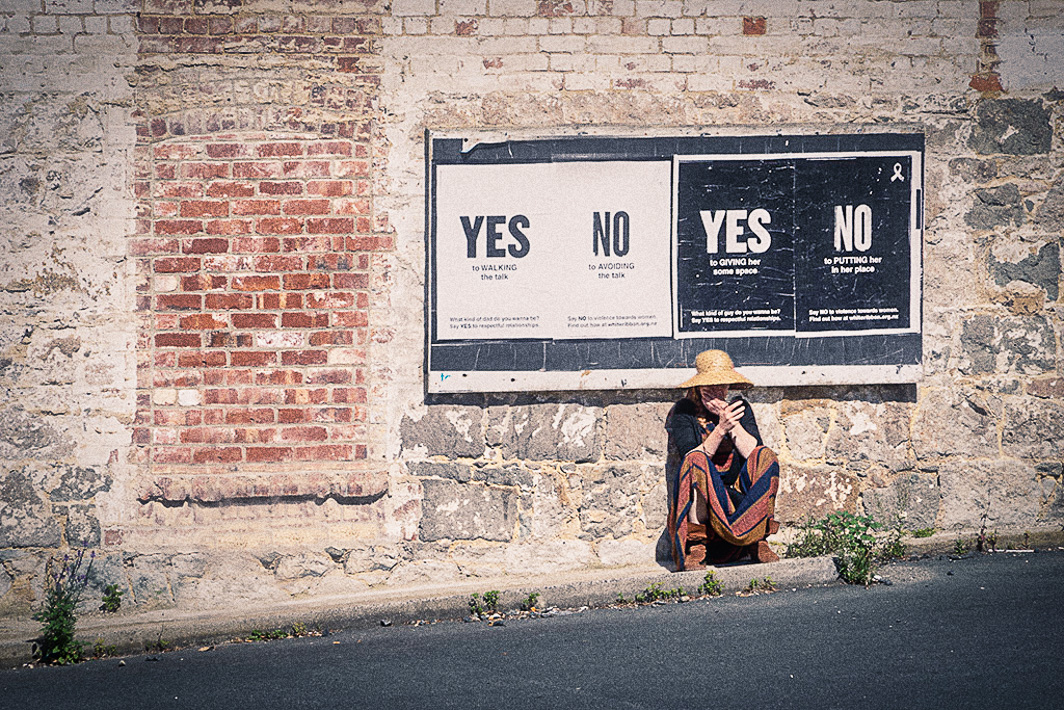 Mary, Your image is open to much interpretation based on who is viewing it. Moving the woman to the position below the sign was a perfect decision. I like the way the colors she's wearing are echoed in the bricks. The sign is fabulous and the fact that she is on her phone makes one feel like she is responding to the sign.