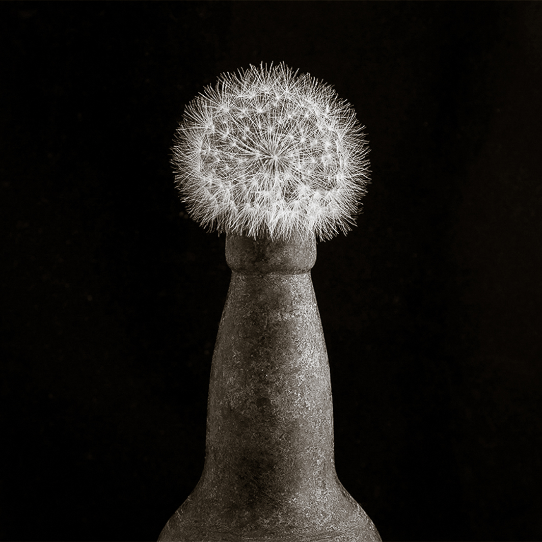 Bunny, Beautiful monochrome treatment with every shade from white to black rendered. I must admit that when I first saw your image, I did some anthropomorphizing of the shape. The first thing that popped into my head was penis. Yes, the shape is suggestive of that body part, but the tilt (both up or down) also suggests a penis. With that in mind, I tried something else with your image. I converted to B&W in LR (not as well as you did), adjusted exposure, left the bottle and seed pod upright but gave it a square crop. I also warmed up the shadows (balance +25; shadows hue 46, sat 23). I think that leaving the shoulders of the bottle in the composition makes the viewer less likely to anthropomorphize the shape. |