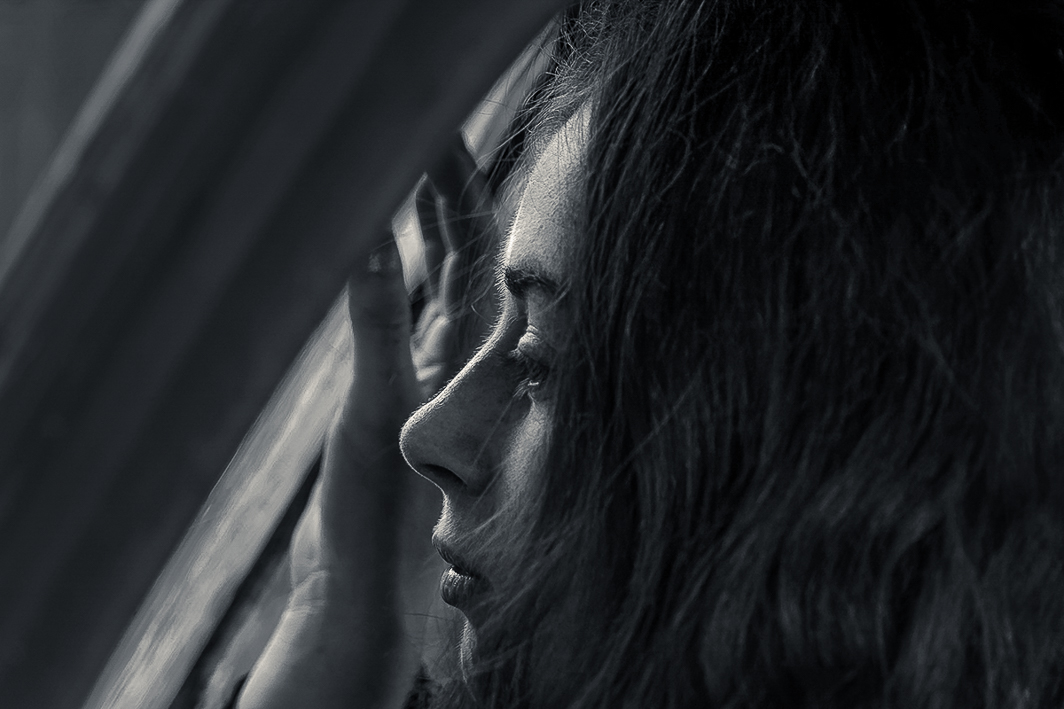 Mary, I really like this image: the backlighting, the diagonals in the composition, the subject's expression. The color image is beautiful with the reds of her hair and the red repeated in the window frame, but as a monochrome it is even more striking.