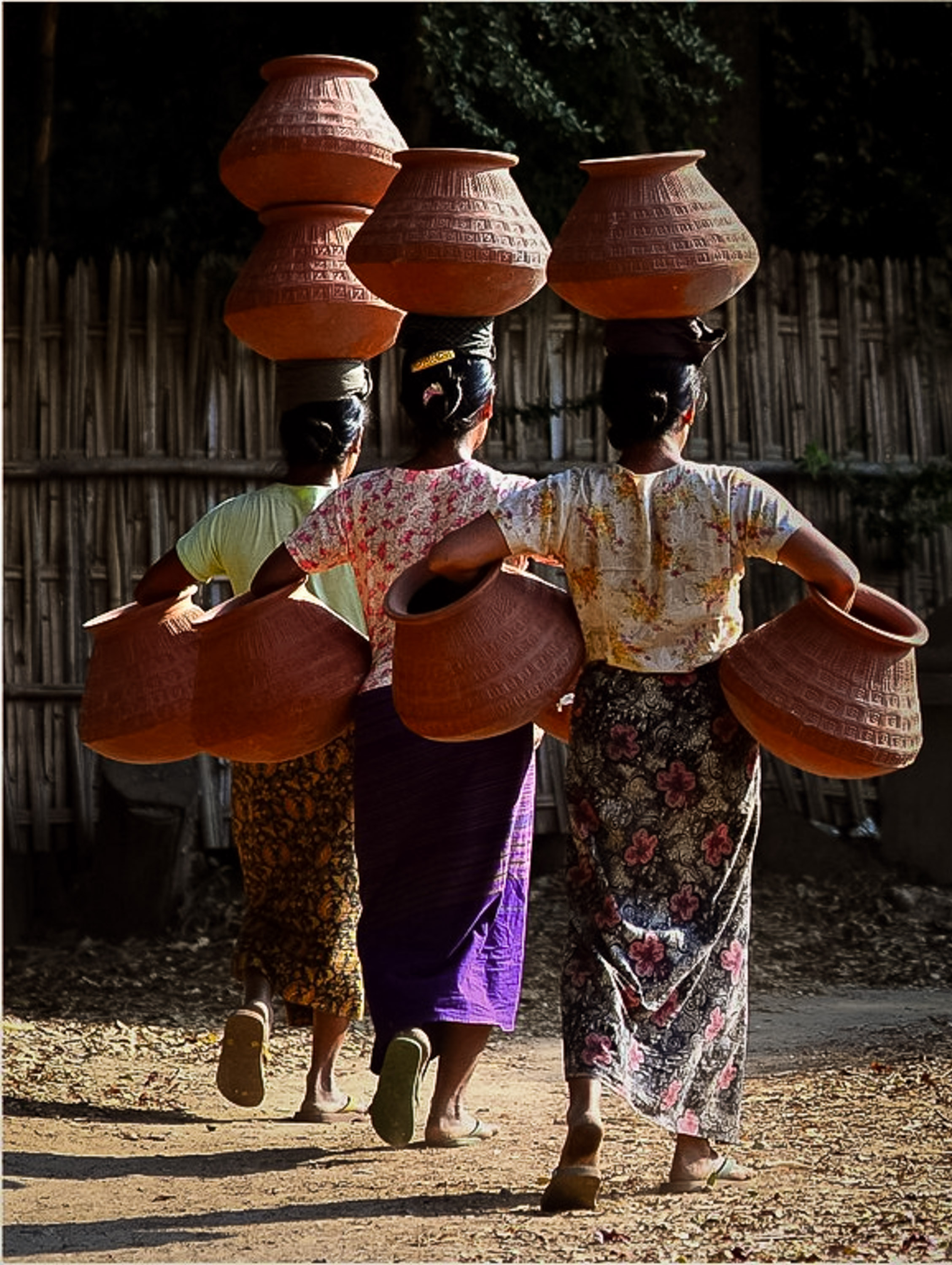I think the essence of what drew you to this image were the 3 women precariously balancing all of these vases so I would change the crop to focus on that. Not sure if you had already cropped your original and might have a bit more on the left. Using Lightroom, I also added a gradient filter to cut down on the harsh lighting coming in from the right and one coming up from the bottom left. I used the brush tool to lift the shadows on some the vases. See what you think. |