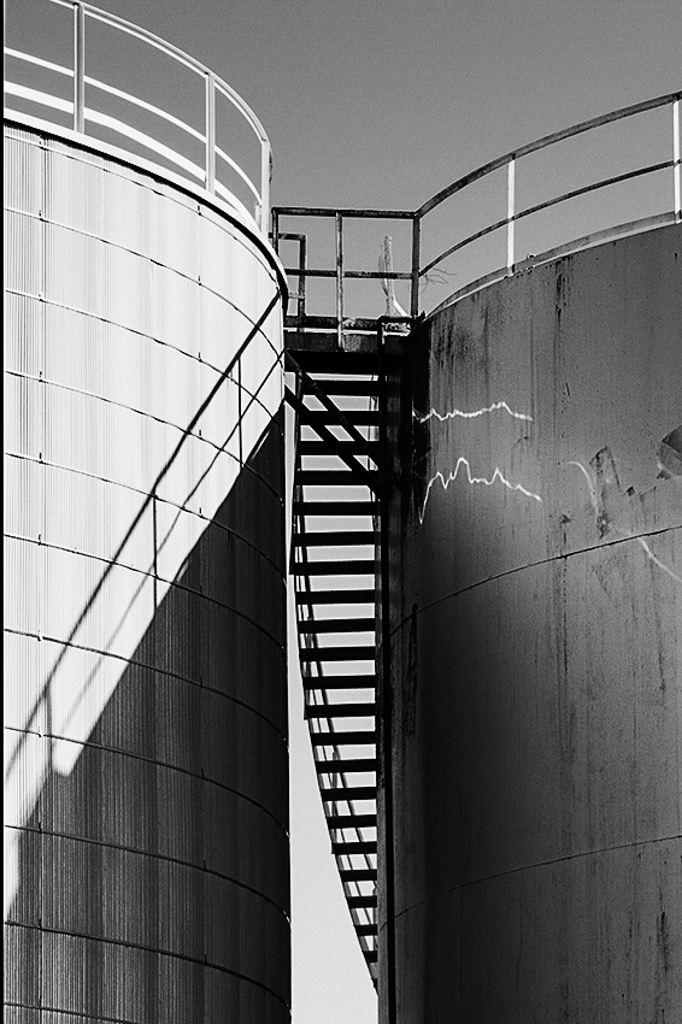 The vertical edges of the tanks, the dark stairway between them, and the strong shadow on the left one are the strongest lines in this photo. I recommend cropping to emphasize these elements. |