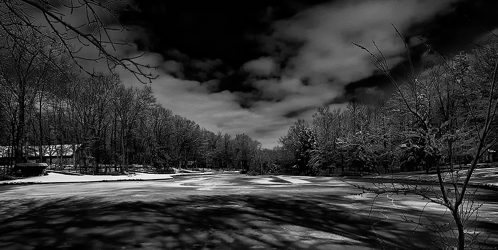 I think the patch of open water detracts from the frozen, depth-of-winter mood in this photo. Cropping it out creates a more panoramic aspect ratio, and makes me feel more surrounded by the cold. |