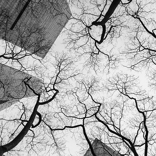 Interesting image. Shape contrast between wandering branches and straight lines of the buildings echoes the strong black and white tonal contrast.