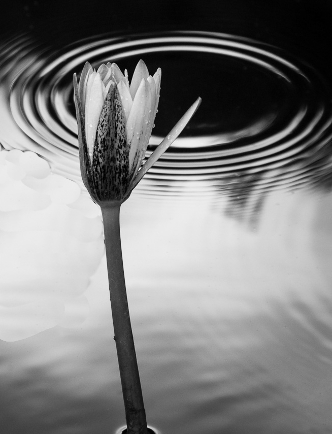 I think the large lily pads detract from the perfectly lit, sharply focused ripple pattern - the interesting background you worked for and captured. My crude attempt at cropping and cloning is attached. |