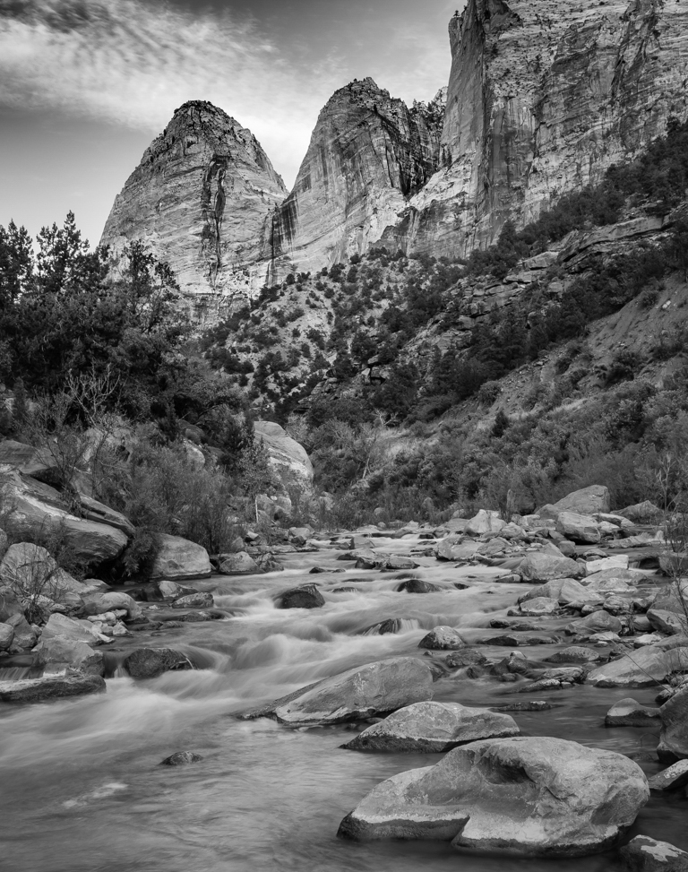 Good exposure settings for depth of field and river blur. Flat light diminishes detail, With Lightroom I brushed some Contrast and Clarity boosts into the background peaks. |