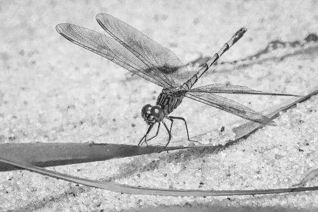 The dark body stands out from the bright background, the transparent wings blend in. In this version I tried for a similar but softer version of this tonal separation for the wings: in LR increased the global exposure by +0.35 then brushed gradually increasing negative exposure into the wings to bring them out. |