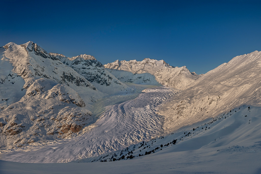 In my experiences two dimensions really makes it hard to show off "how big" something is, unless you provide a known size comparison object. Given the photo at hand as taken, my only suggestion would be lighten up the shadows, and try to place emphasis on the glacier itself. I took the liberty of trying, but using a small jpg only so much can be done. Also, this is a perfect image to try to replace the sky with one with clouds. |