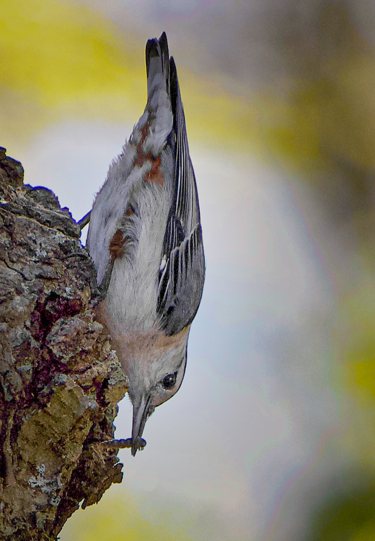 Nice bird photo, with an action story. Timing of the capture was great. I personally have to keep tilting my head since he's facing downwards. But that was what was happening. Nice catch light in the eye. I agree with the cropping comments, and really feel as it would be more successful with the entire background subdued. I took the liberty to try a few things. All using ACR. Darkening the entire exposure and then highlighting the bird and branch. Notice extra "texture" and sharpening. Doing this with a jpg, introduced some purple fringes around the back leg which I think could easily be removed if the image was RAW and a bit more time. |