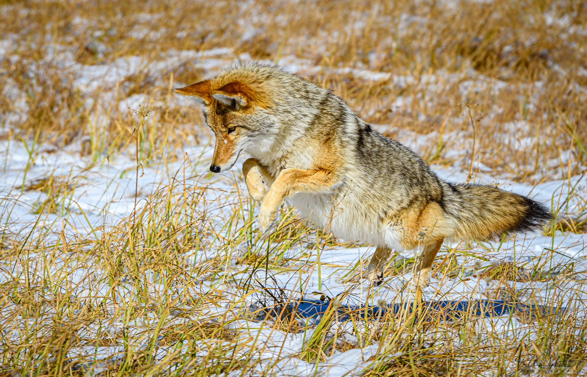Coyotes are very cool animals. They have a bit of a bad image, I believe because they "howl" and scavenge around a lot, or perhaps the Roadrunner cartoons. They do keep the rodent population in check. They are a mix of grays and reds. I've included one of my previous shots which shows off the coloration a bit more. They like to "pounce" on small animals as this "airborne" attack may catch them unaware. |