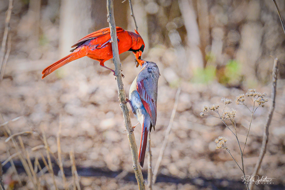 Actually, I played around with the color and while I know female cardinals typically appear more brownish, this is the color that comes across due to early morning light and the fact the female was more shaded and I believe the angle. I really couldn't pull much more brown out of her with the dodging I did. I believe the red is also very close to the color in the morning light, but I find most people (other than an ornithologist) react better to a little extra sat, so I think I only pushed it to about +15. It appears toned down in the print. I also tried to minimize the green on the right without removing it. This jpeg is showing I'm hitting the limit there. Perhaps it might be better to clone it out. I could remove the one twig as I did others on the side. I didn't think it detracted much but it might be worth a try to remove. I added an image from a few frames prior to this one and I really didn't like the colors that came out as I tried to make the female look brownish. The new one shows more of the bug but I lose the eye and face of the female. |