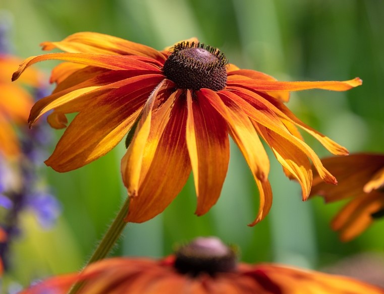 YOU WERE ABSOLUTELY RIGHT ABOUT THE COMPLIMENTING COLORS, THE SUBJECT FLOWER IS TACK SHARP, AND WELL EXPOSED THE BACKGROUND BOKEH IS HANDLED WELL WITH THE F/STOP YOU CHOOSE,AND THE SOFTLY OUT OF FOCUS OF THE OTHER FLOWERS, MAKE THE VIEWER'S EYE RETURN TO THE MAIN FLOWER.