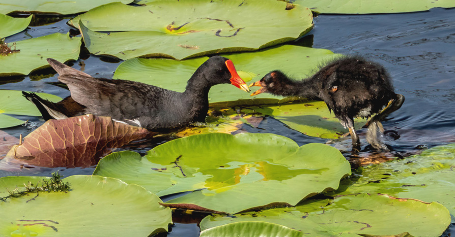 THE BIRDS ARE THE SUBJECT, NOT THE LILY PADS SO SHOW FEWER OF THEM AND CROP IN ON THE BIRDS.