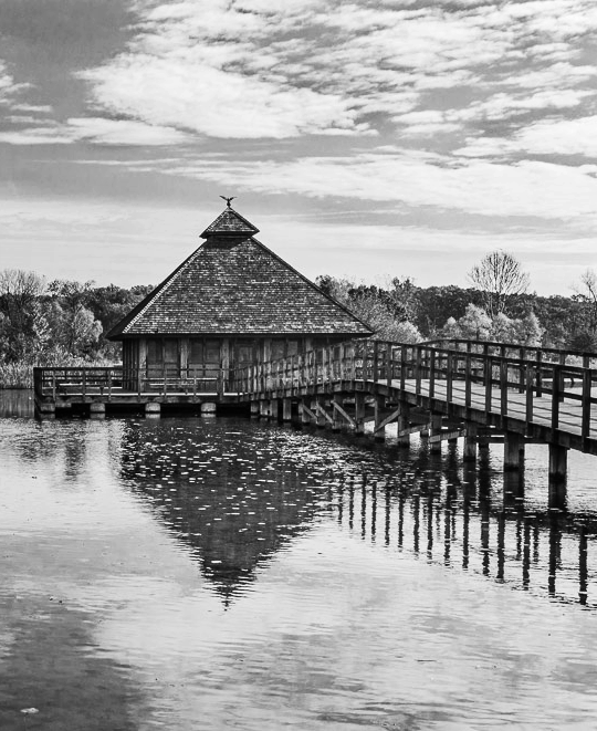 However, I might go in a different direction with the composition. While I like the quality of trees and reflections on the left, I feel the relatively large areas of blank sky at upper left and water on the lower left draws attention from the main subject, the cabin and walkway leading to it. I might consider a different (radical?) crop that concentrates attention on the subject and adds interest with the clouds in the sky and quality of the water. That also makes the walkway a very strong leading line.