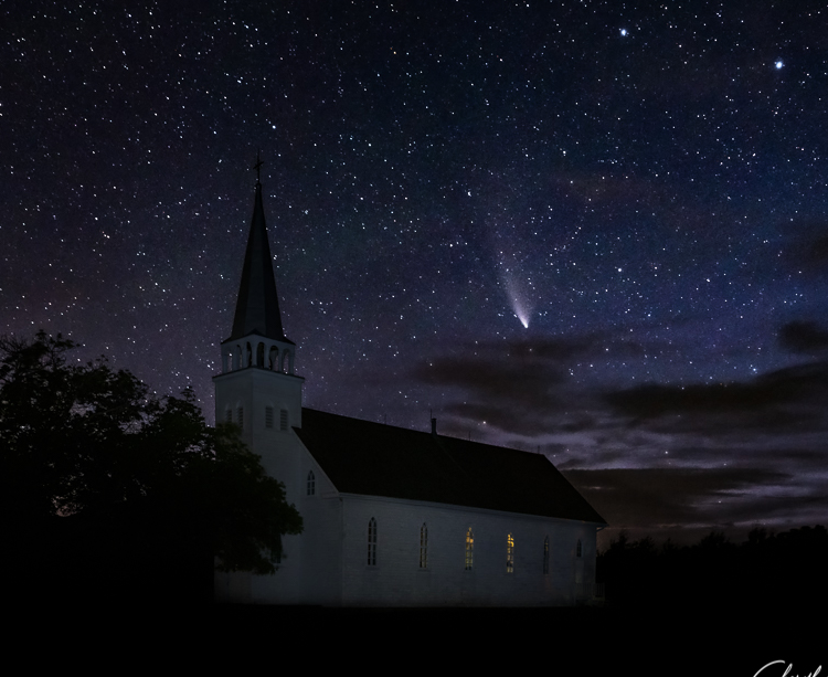 Nicely done! I got several photos of NEOWISE, but none with such a nice foreground. I even like the clouds, adding a bit more interest to the sky; fortunately they just missed the comet. Aside from adding interior lights I think the light/reflection in the windows is a nice touch -- from the same light?