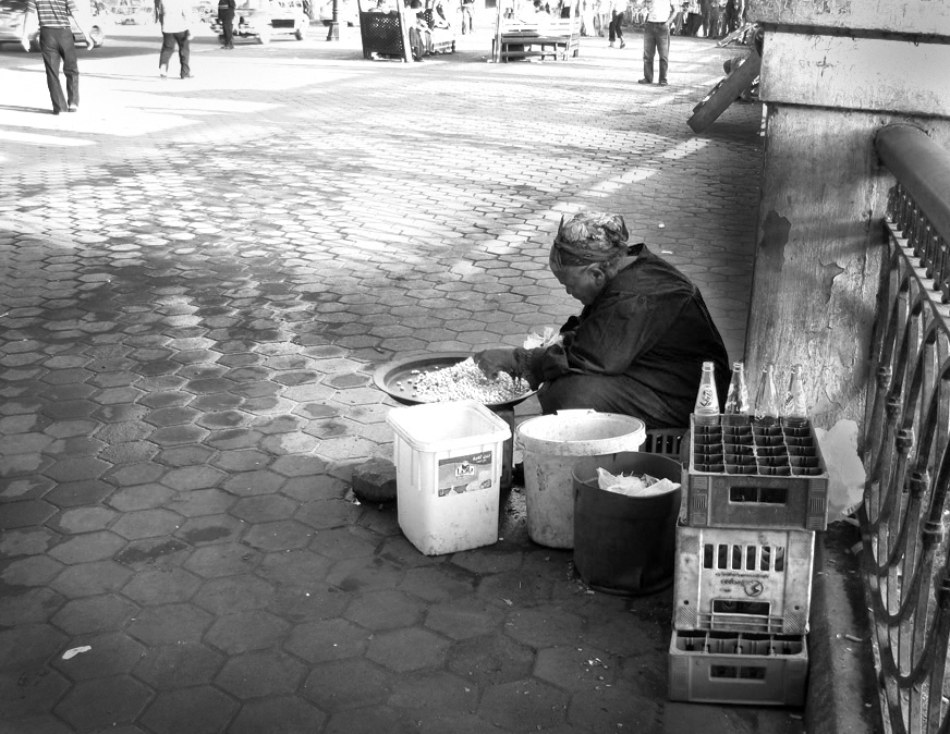 I crop down the bottom and right to place the lady in 1/3 line from right(I did not crop the street people above). By showing the street people, it become obvious that her business is not busy.