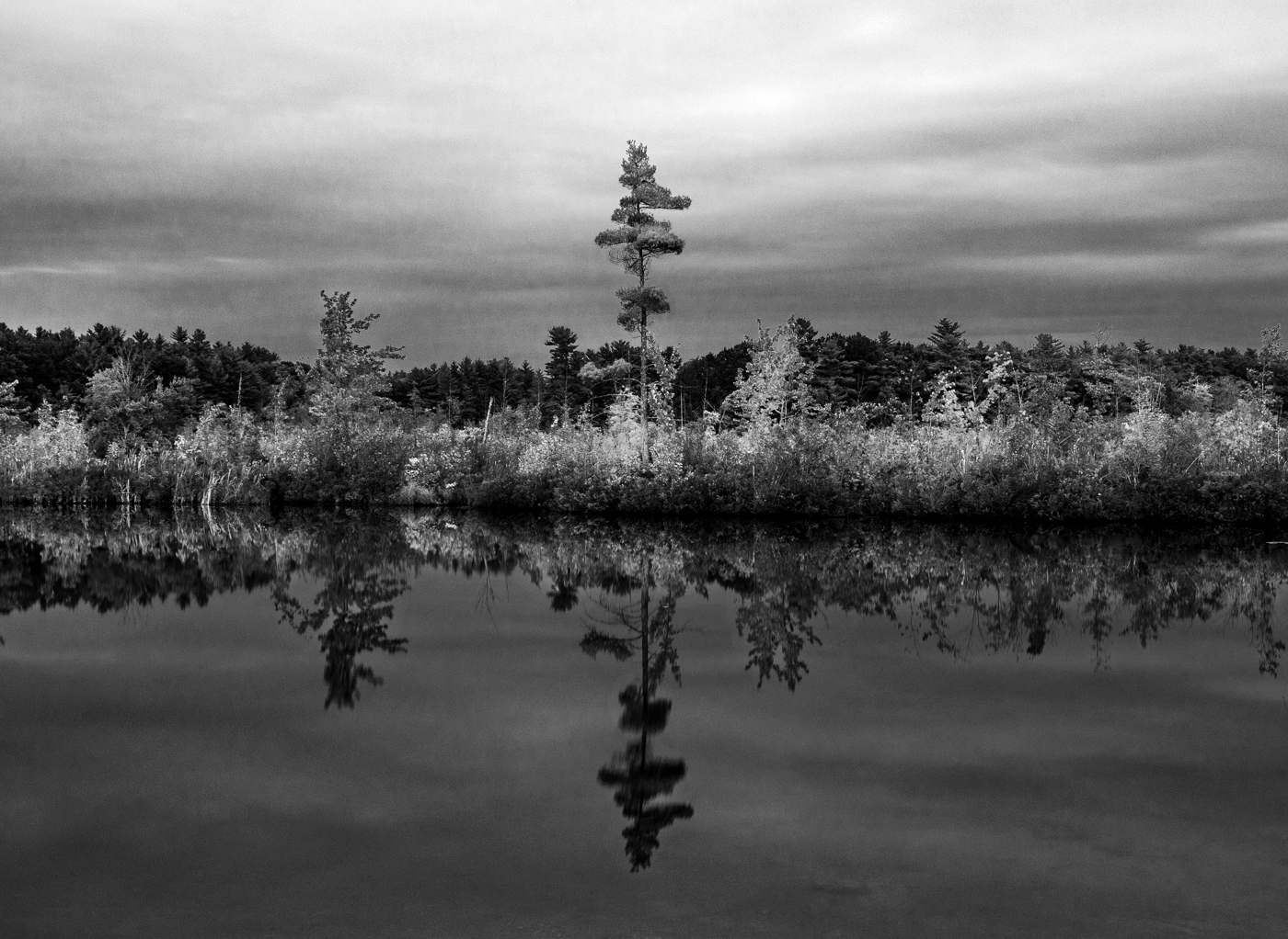 I bumped up the white tones and add contrast. Then, lighten up the reflection a bit and add the light in the forest.