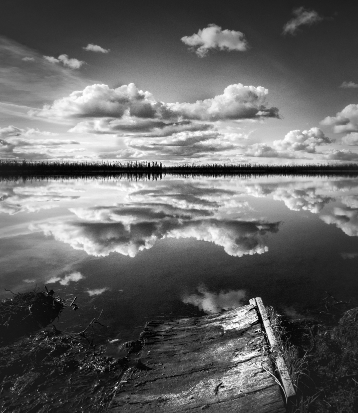 2. Composition - the bush in foreground in right corner is a dead space, that area does not add value to the image. The board in foreground lead the eye to the center but the board itself is not strong enough for catching attention. (in addition, it is dark) But the image has very strong cloud action and reflection, so my eye can go straight to the reflection without a help of foreground leading line. So currently the big foreground neutralize the power of the reflection. It is a bit pity.