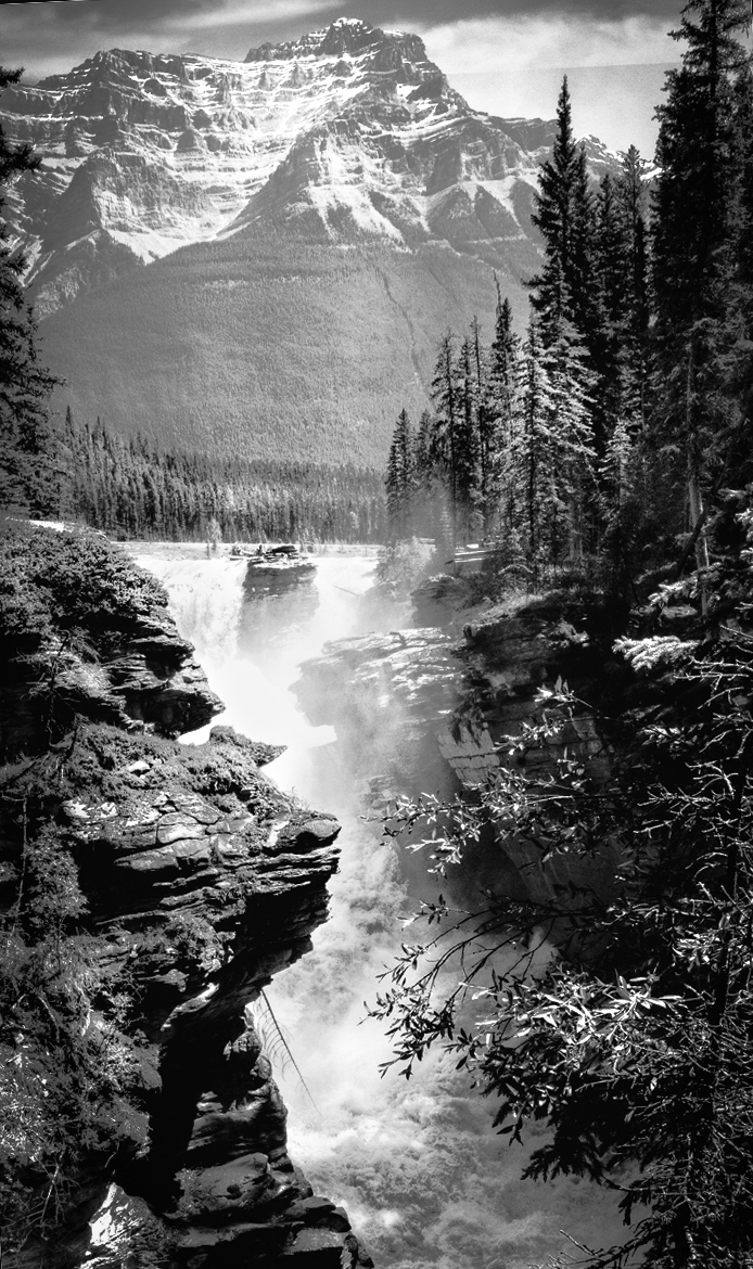 First of all, the composition is great. Nice combination of cliff and powerful waterflows with the Rockies at the background. This is super. The cliff is blocking the sight of the fall a bit, so I would step right to open up the sight of stream a bit(if you could). I guess you can recover the details of waterflow from the RAW file (if you shot in RAW) - some part of stream looks blown out.