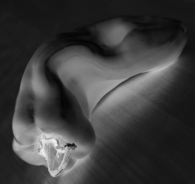 I like to lighten up the hull a bit more. For me the shape of this paper does not have so strong character as Edward's peppers, so I would like to see the details of full to catch attention. And I would rotate the image a bit. That way I can present more depth in the image. That's all my personal taste. I am attaching my attempt here. This is what I would do in conversion from the original.