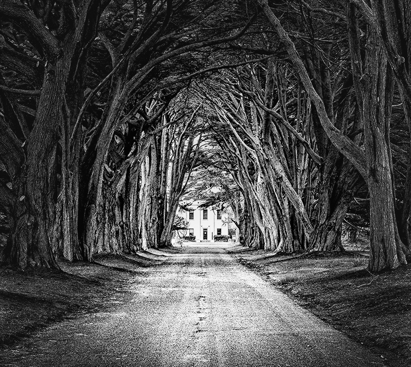 1. Line of trees are too much and complicated for my eye. Attention need to go to the tree tunnel but not line of trees in my view - I would crop the left/right and start with the trees with good characters.
