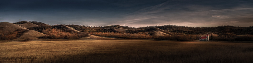 I would change the scene in the sun set. Half of the frame gets dark; the other half gets the last sunlight (so rolling hills still get the light). That would give an impression of "dark night" is coming soon. The church will be standing in a vast land alone in dark. Would it give you a "loneliness" feeling?