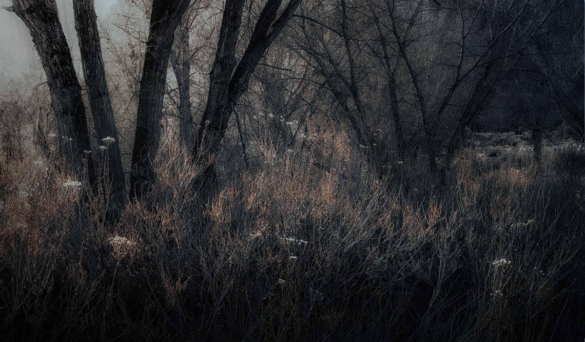 First, reduce the exposure of the image globally. Locally, hazed the light source significantly, darken down the trees on left, add blue tint in upper right, and paint touches of light on the main bush. And finally desaturate globally slightly.